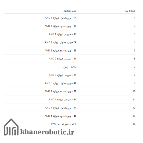 آیسی ۱۴ پایهای است و هر دروازه AND دو ورودی و یک خروجی دارد. پینها به شرح زیر هستند: